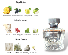 It opens with a confident burst of pineapple and bergamot, sharpened by crisp apple and the dark bite of blackcurrant. The heart moves with purpose—smoked birch and pink pepper spark over grounded patchouli and a thread of jasmine. As it settles, musk and oakmoss meet ambergris and vanilla, leaving a smooth, enduring trail that signals authority long after you’ve left the room.